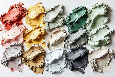 Close up view of an array of thick, smooth paint swatches in various neutral tones, showcasing texture.