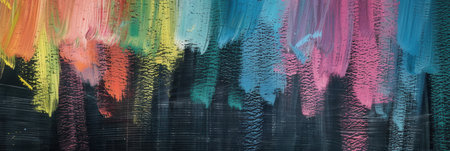Colorful brushstrokes adorn a dark green chalkboard, creating an expressive and lively artistic display in a classroom setting.