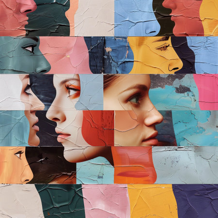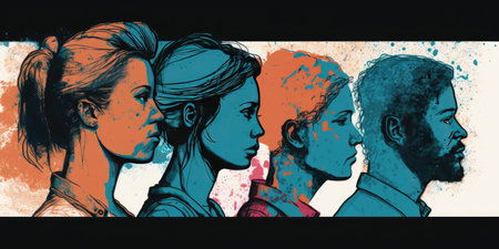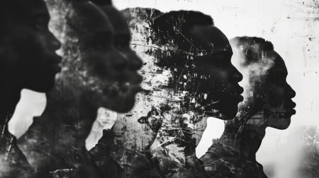Four individuals of varying ages and ethnic backgrounds stand in profile, highlighting their unique features against dark and bright backgrounds, emphasizing diversity.