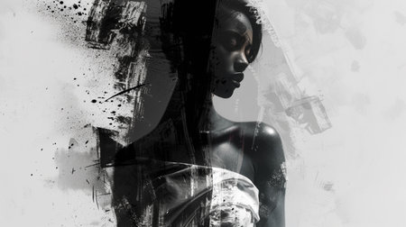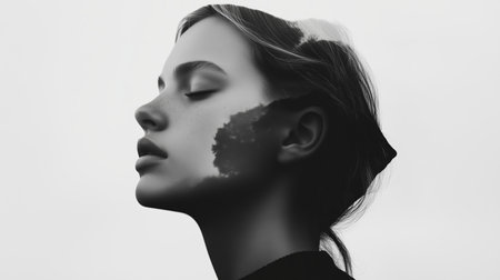 A profile view of a serene young woman with abstract paint patterns on her face against a minimalist background captured in monochrome