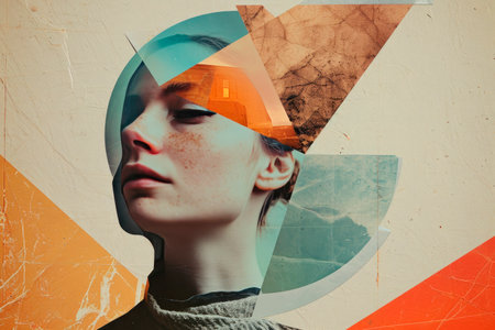 A woman's face is shown in a collage of squares and triangles. The image has a modern and abstract feel to it, with the woman's features being distorted and fragmented. The use of black