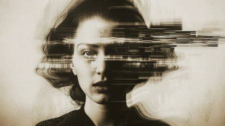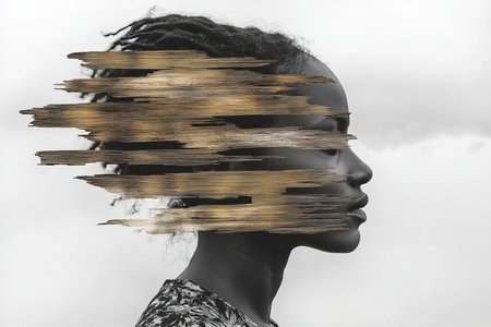 A Surreal Portrait of a Fragmented Woman in Obscure Visions with Black, White, and Gold Tones