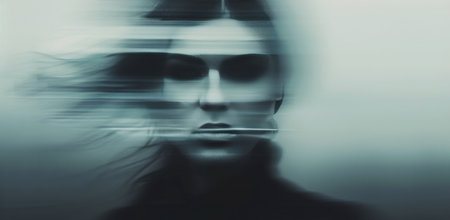 A woman's face is blurred with horizontal motion lines, creating a sense of speed and movement. Her hair is flowing in the wind.