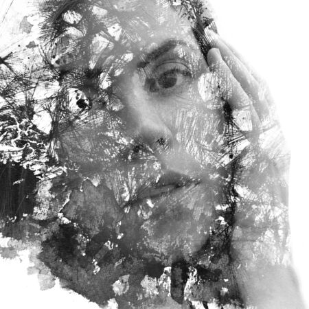 Paintography. Double exposure. Young girl with hand on face disappears behind hand made ink and pen drawing with lines and shapes dissolving into her face. Black and white