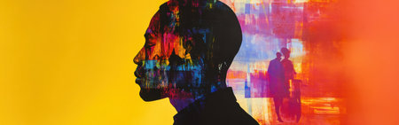 A captivating portrait of a woman with a thoughtful expression, enhanced by vibrant abstract colors and textures, highlighting artistic creativity and emotion.