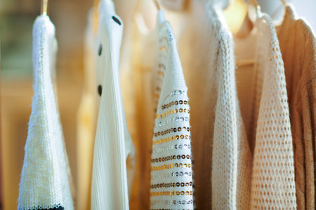 shopping and marketing concept, knit jumpers in alternative colours with Must Have and Fashion Trends text on price tag