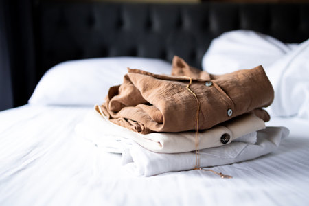 Neatly folded brown and beige clothes on white bed in calm bedroom atmosphere