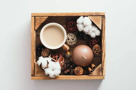 Wooden box full of cotton, autumn decor, coffee cup on white background. Flat lay, top view, overhead