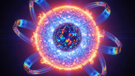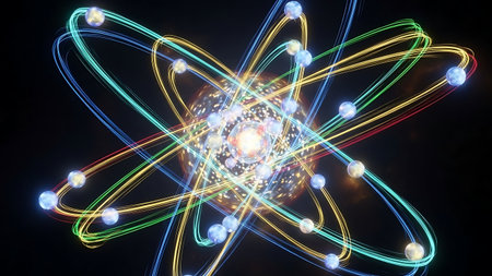 Vibrant atomic model showing particles and energy in motion, illustrating the dynamics of atomic structure against a dark background.