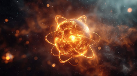 A vivid depiction of an atomic model, highlighted by glowing particles and flames set against a dark backdrop, symbolizing energy and science.
