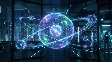 A bright and vivid depiction of an atomic structure, showcasing colorful particles orbiting within a transparent sphere, set against a dynamic, illuminated background.