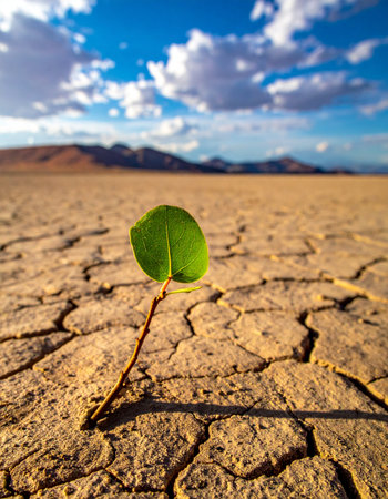 A close-up shot of two small green plants pushing through the dry, rocky ground, symbolizing resilience and new life in an otherwise barren landscape.