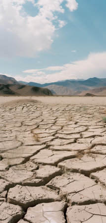 Bright sun shines over a dry landscape, revealing cracked earth and distant mountains under a clear blue sky.