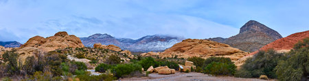 Red Rock Canyon Sandstone Formations with Snowy Peaks Panorama