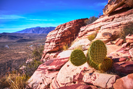 Prickly Pear Cactus and Red Sandstone in Sunlit Nevada Desert Landscape