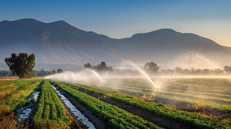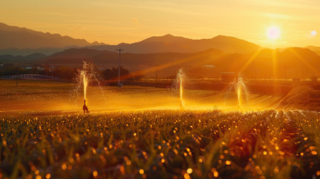 Automated irrigation system watering a field of crops at sunset, creating a picturesque scene of agricultural efficiency and natural beauty with mountains in the distance