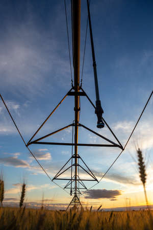 detail of a circular pivot irrigation system in a cereal field before mowing