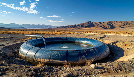 In the vast, sun-drenched expanse of a remote desert valley, a steady stream of water fills a large trough, creating a vital oasis.