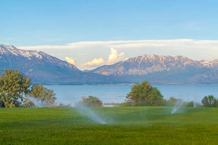 Water from sprinklers on a green grassy land with scenic nature background. Automatic watering system viewed against lake, snow capped mountain, and cloudy sky.