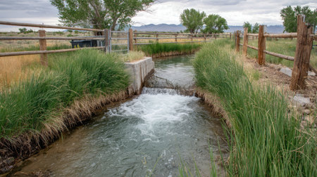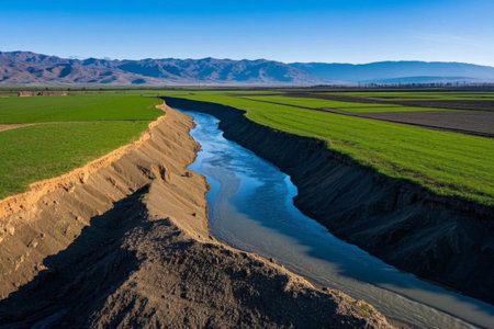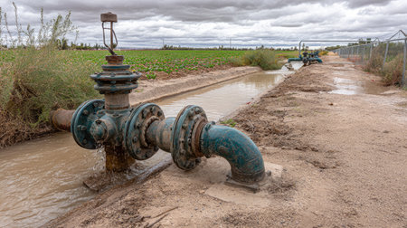 flooded irrigation canal overflowing into adjacent field, created with generative ai