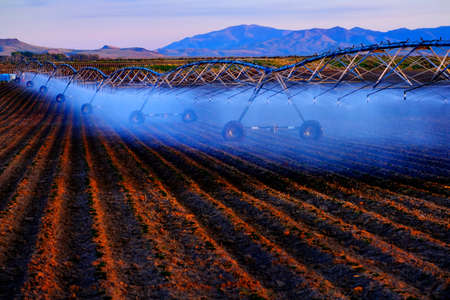 As the sun sets over a vast agricultural landscape, a modern irrigation system casts a wide spray of life-giving water onto rows of thriving crops.