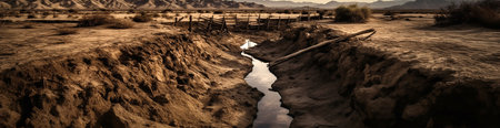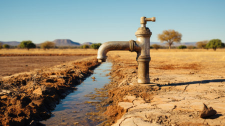 Weathered terracotta irrigation pipe in a parched desert landscape with cracked earth and sparse vegetation, under a clear sky with distant mesas, symbolizing water scarcity.