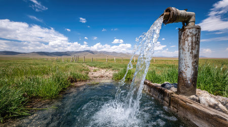 A picturesque scene featuring a metal pipe releasing fresh water into a small basin, surrounded by lush greenery and open plains under a bright blue sky.
