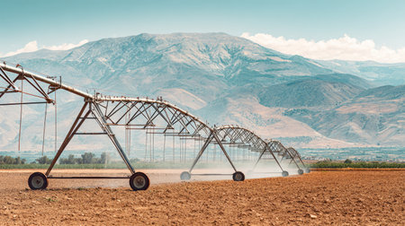 Overhead irrigation system waters rows of crops in a vast agricultural field, showcasing efficient farming practices amidst mountainous scenery and clear blue skies.