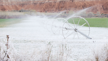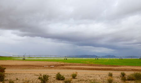 Large agricultural irrigation system in a field in the Utah Valley, USA with a cereal crop and mountain backdrop