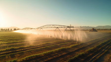 A stunning view of a modern irrigation system in action during sunrise, casting a misty atmosphere over agricultural fields. This image captures the serene beauty of farming technology at work, highlighting the importance of irrigation in crop growth and sustainability.