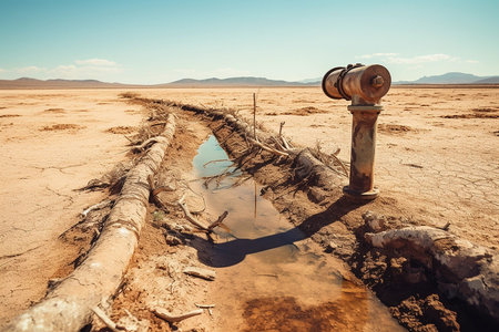 Dry cracked desert with old water pipe. Water scarcity concept.