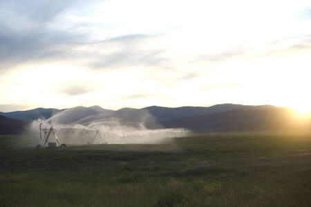 Farm field featuring rows of green crops being irrigated by sprinklers at sunrise, with misty mountains providing a scenic backdrop in the early morning rural light