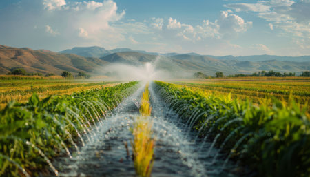 A sprinkler system is spraying water onto a field of crops, providing much-needed hydration to sustain their growth and productivity. The water droplets glisten in the sunlight as they fall onto the lush green crops, ensuring their health and vitality. The efficient irrigation process helps optimize crop production and yield.