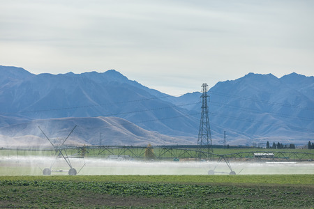 Long irrigation system pipe used to water vast grass field in New Zealand