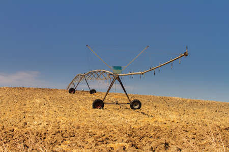 Wheel line sprinklers for irrigation of furrowed plowed farm field dirt lines to grow green crops