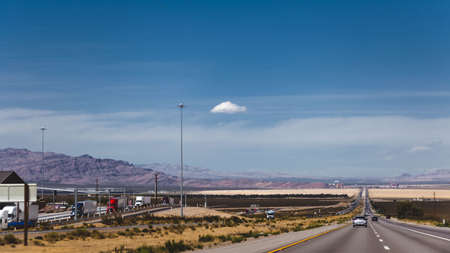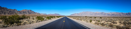 Long straight road in the desert, Nevada, USA. Panoramic view.