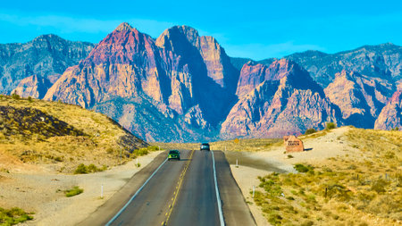 Ground Level Red Rock Canyon Mountains Roadside Cars and Desert Landscape