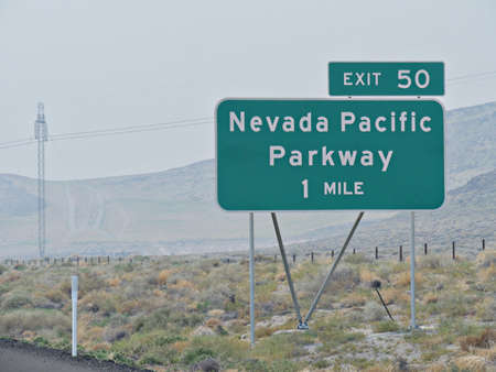 Roadside sign at Interstate 80 with exit and direction to Nevada Pacific Parkway.