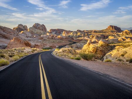 Scenic view on the road in the desert during a cloudy sunrise. Taken in Valley of Fire State Park, Nevada, United States.