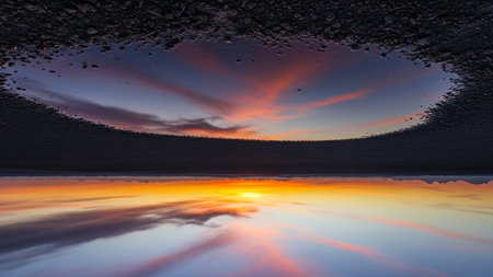 A vibrant sunset with orange and pink clouds reflects in a puddle surrounded by dark gravel, creating a surreal, inverted landscape.