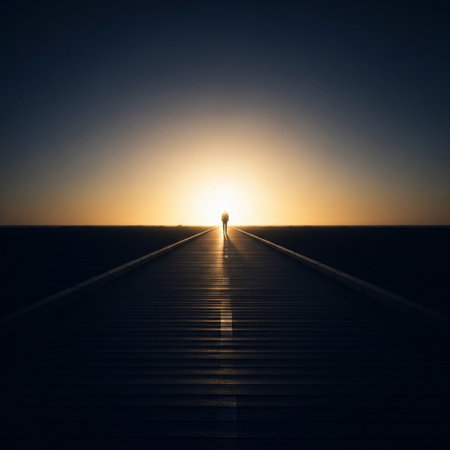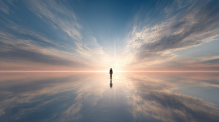 A person looks toward a soft glowing horizon during sunset, surrounded by a reflective surface that enhances the colors of the sky.