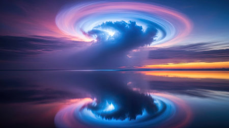 An ethereal scene depicts a large cloud formation reflecting symmetrically on a calm water surface. The composition features vivid colors, including blues, pinks, and purples. The soft textures and dynamic lines evoke an abstract style. This image has potential applications in various creative and illustrative projects.