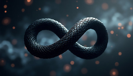 Infinity symbol rendered in a dark reptile texture is featured against a blurred background with orange glowing particles, ideal for abstract concepts and visual metaphors.