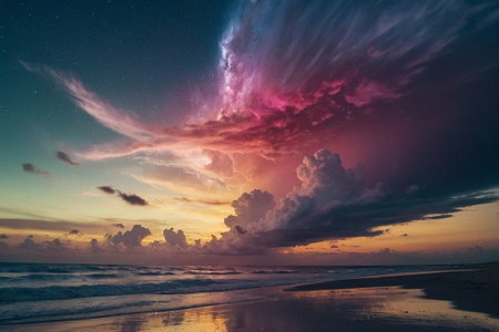 AI Generated. Gradient colorful cloud starry sky and water reflection