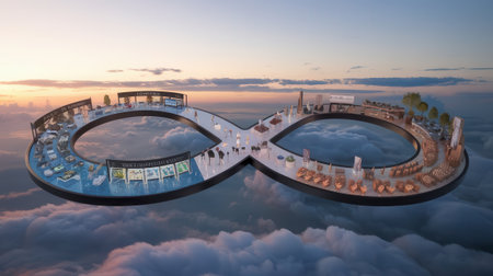 3D rendering of the city in the clouds at sunset time.