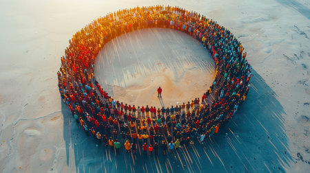 Aerial view of the crowd of Muslim people attending a religious ceremony. A panoramic shot capturing people from different cultures