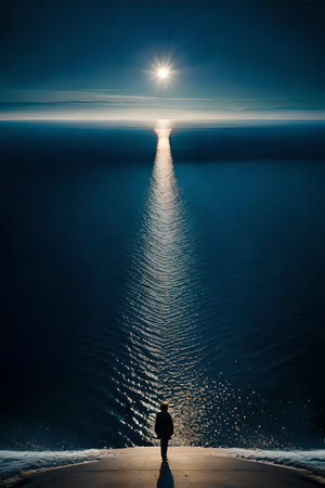 Moonlight in ocean landscape. The ocean stretches out as far as the eye can see, its surface a canvas of deep, midnight blue. AI generated image