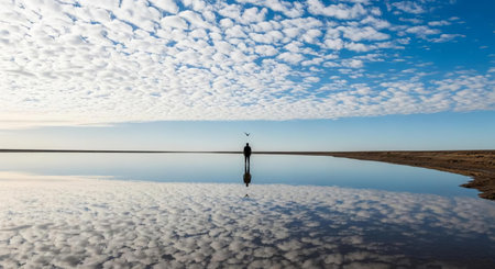 Reflection of a man in a salt lake with clouds in the background
