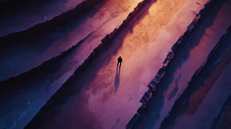 High-angle view of a solitary person standing on a textured, patterned surface. The surface is divided by intersecting lines and exhibits a gradient of muted colors, from deep purples to vibrant oranges and pinks. The person's shadow is clearly defined. The image has a sense of isolation and contemplation.