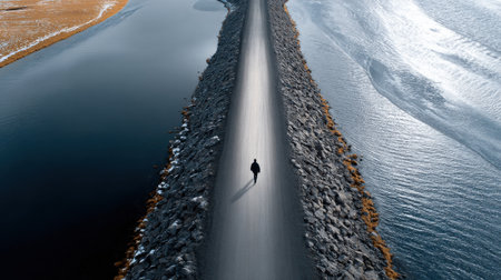 A man is walking on a road that is next to a body of water. The water is calm and the sky is clear. The man is walking alone and seems to be enjoying the peaceful scenery